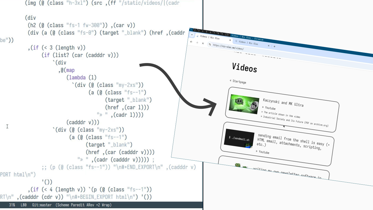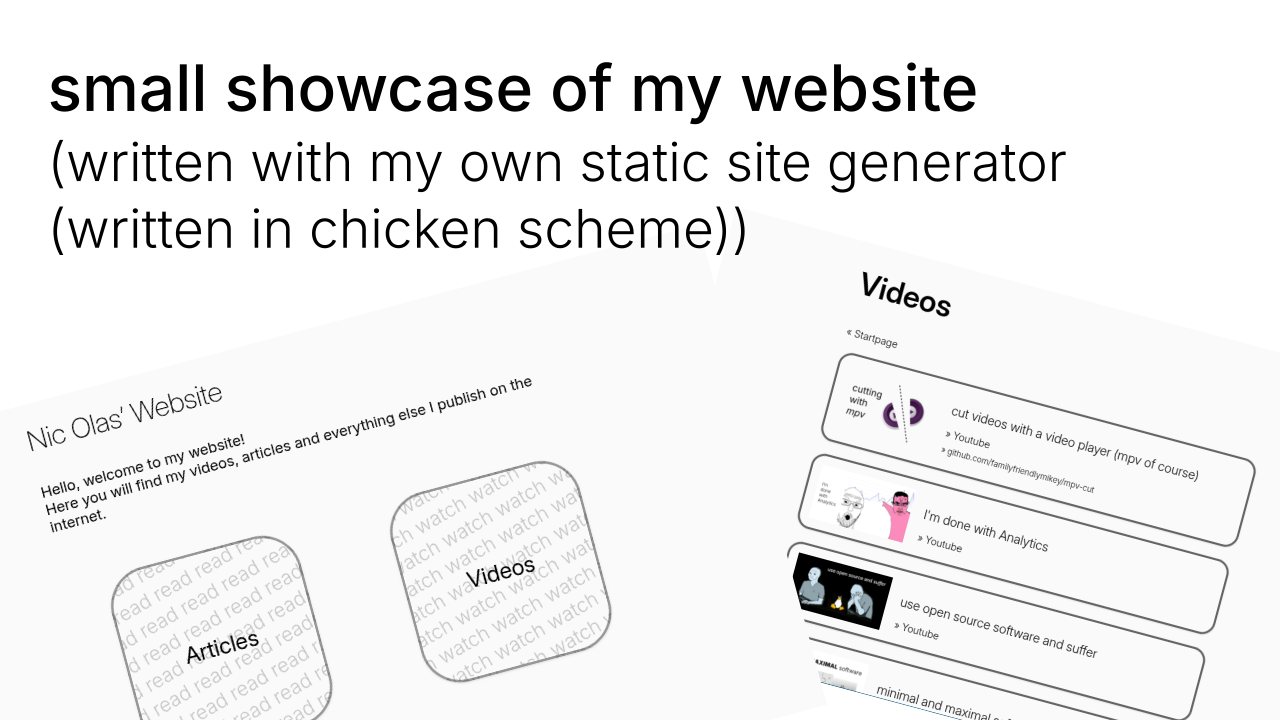 small showcase of my website (written with my own static site generator (written in chicken scheme))